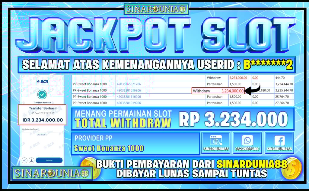 Selamat kepada USERID B*****2 atas kemenangannya disitus SINARDUNIA88 Sebesar RP 3,234,000,-