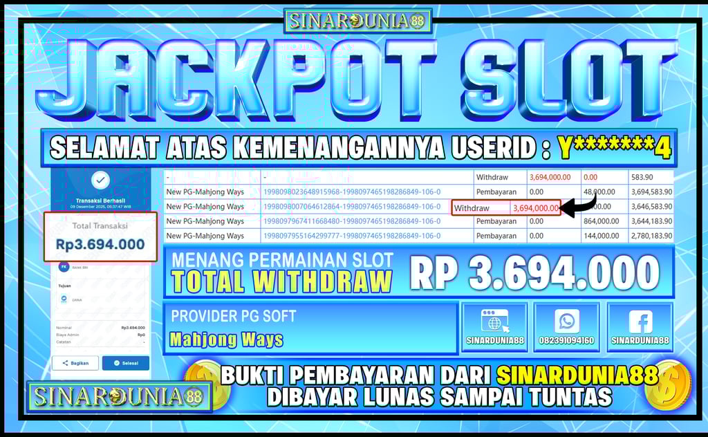 Selamat kepada USERID Y*****4 atas kemenangannya disitus SINARDUNIA88 Sebesar RP 3,694,000,-
